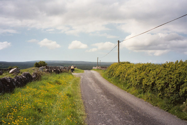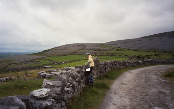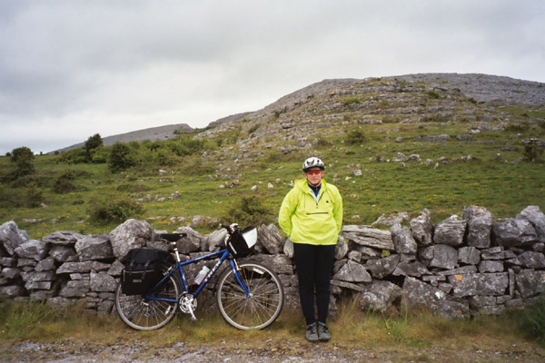 A few more miles brought us to the Burren Center in Kilfenora (population 125). We picked up a couple of postcards there, but at this point, I was starting to get worried about our timing, so we didn’t stay long. A couple more miles brought us to a larger road down out of the Burren via "Corkscrew Hill". Corkscrew Hill lived up to its name. It was a steep descent with frequent switch-backs. According to the information we’d gotten from Cycle West, it is a venue for the Galway Motor Club’s annual hill climb event. On the way down, I hit a top speed of 33mph which really felt like something on this touring hybrid with luggage bouncing all over the place. Our B&B awaited a bit past the bottom of Corkscrew hill, and we were quite happy to see it after about 36 miles and 9 hours of bicycling and tromping around ruins!