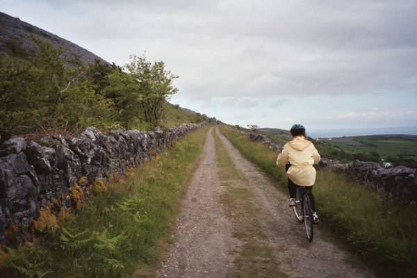 Our turn off of this climb comes before we reach the top (and we’re none too sad about this!), and we turn onto a (the?) "green road". Fidelma is waiting for us here where we try yet another helmet for Carolyn trying to get the sizing right. She tells us that the green road is an old cattle road more-or-less the same as it was centuries ago, only different by the size and shape of the wheels that travel over it. Stonework walls snake across the landscape here (and most of our destinations actually). These walls are impressive partly just for the quantity, and partly for the construction techniques. I think about the labor involved to pick up each stone and put it in its new place in the wall, and it boggles my mind. Then, I look at the wall itself and see that it has stood the test of time completely without mortar. It’s just rocks skillfully piled one on top of the other, and there they have stayed for hundreds of years. One of these walls is near the crest of a hill that we are riding along below, and sky can be seen through the stones where they don’t match each other.