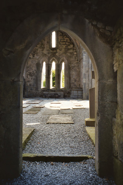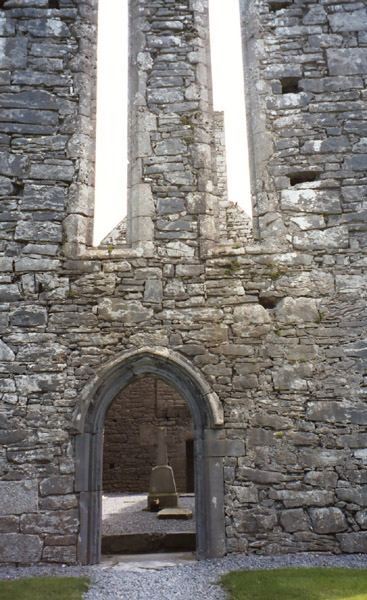 After departing the green road, we wander through the countryside, past a church just getting out and eventually we find our way up to the ruins of Corcomroe Abbey. It was an abby of the Cistercian monastic order and Carolyn was curious to compare its shape to Cistercian abbeys that she had seen in France. The grounds of the Abbey are still used as a cemetery, and we were told that Easter Mass is still celebrated at the Abbey.