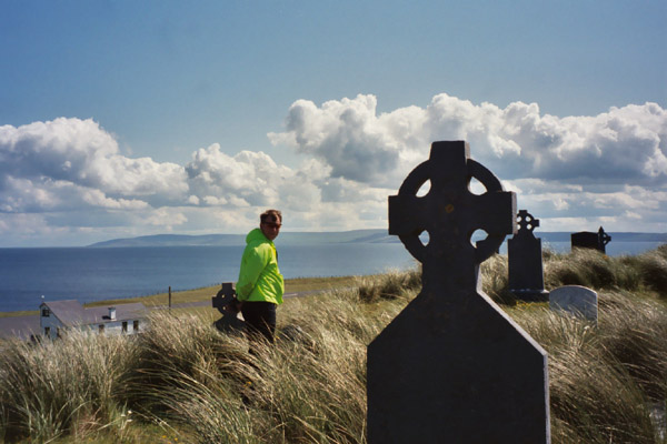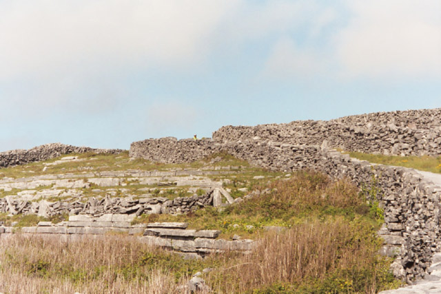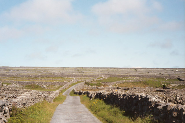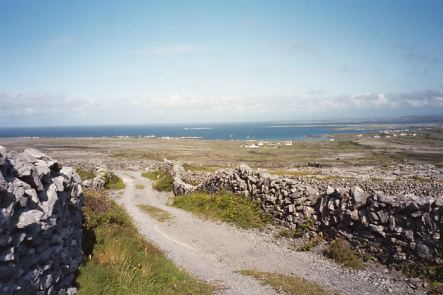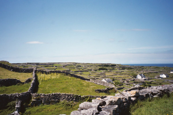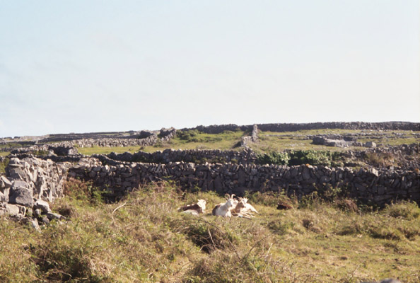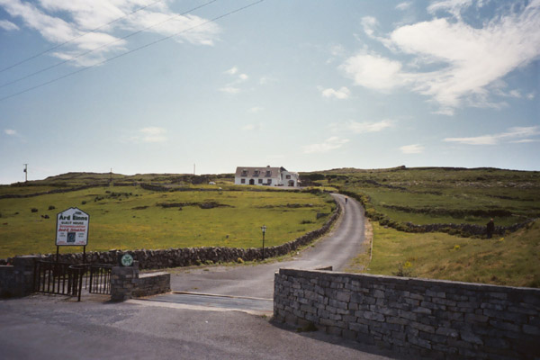 We then proceed to our B&B for the night, Árd Éinne where we check in and drop off some of our stuff before going back out. Looking for a map, postcards and stamps, we go to the Tourist Center which would have been more appropriately named the Irish Kitch Shop. We have a very simple map of the island that we got from the ferry folk (not to be confused with the fairy folk). We figure that will do so we start to head out. We find a post office which satisfies our stamp needs, and we proceed across the island. Our lack of a proper map does doom us to failure to find Dun Aengus (Dún Aonghasa), a huge stone fort on the island though we think we catch a glimpse of it from the distance. However, we do find a lovely, secluded sandy beach, miles of lightly travelled roads, and gorgeous views of stone walls snaking through an Irish countryside where the Irish language (Gaelic) is still spoken.