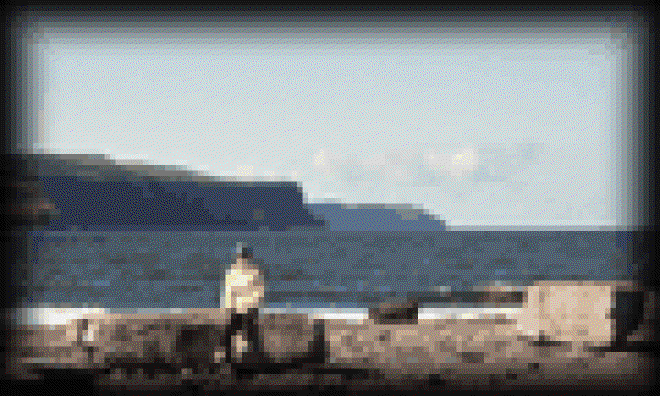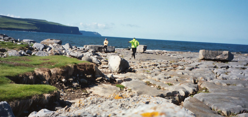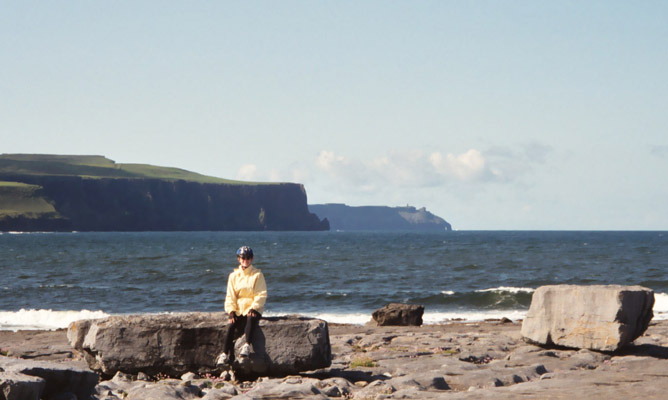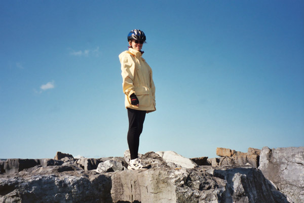 Photos here are of Carolyn on the rocks, AC trying (and failing) to get beside Carolyn before the timer goes off on the auto-shutter, and some worn structure on a small, odd island just out in the bay near the pier at Doolin.