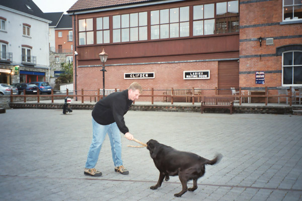 After dinner, we walked around Clifden some, and as we were touring around an old railway station that had been converted to shops and apartments, we came across a dog with a stick in its mouth. Well, I have a history of dogs-and-sticks in Ireland, so I know what to do when approached by such an animal. This dog, however, was loath to give up his trophy. Still, it was clear that he wanted the experience, so I finally wrested it from him and threw it. He thundered away to retrieve it and returned to my general vicinity.