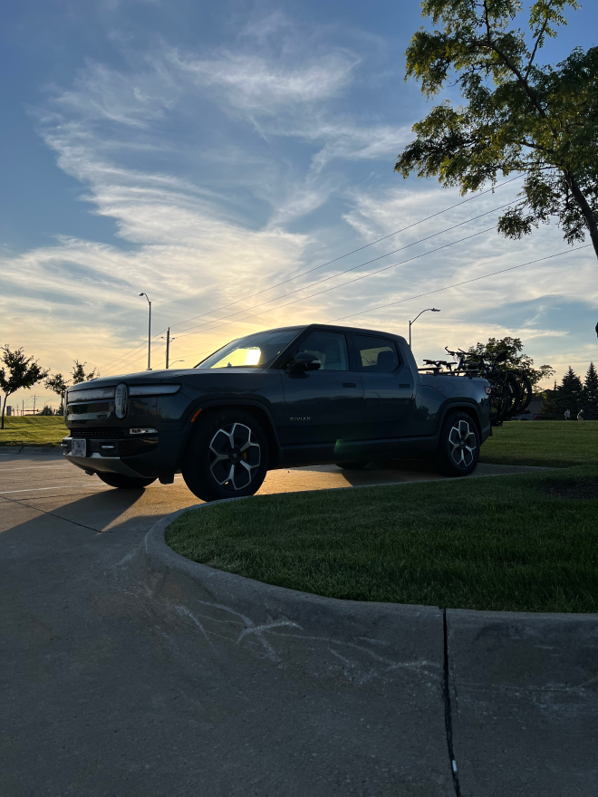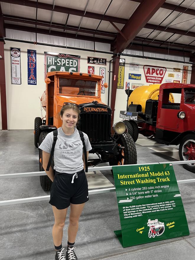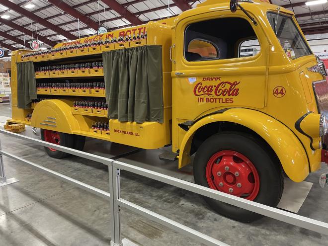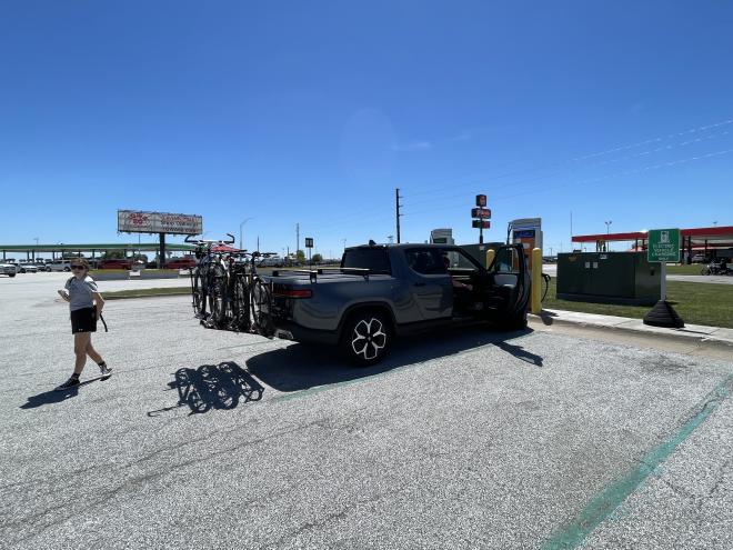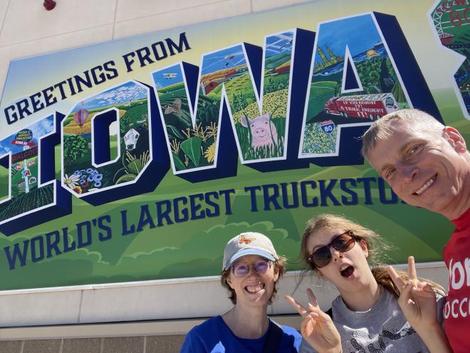 Finally, we get underway, but I do still have a 3:00 (EDT) meeting to attend, and the timing works out great for us as we land at the Iowa 80 World’s Largest Truckstop. We plug Rosie in (there’s both a Tesla charging station and a ChargePoint), I pop up the sun shield, and move over to the passenger seat for my meeting. Sam and Carolyn go exploring and find me a sandwich and then find some food for themselves. When I wrap up my meeting, I find that they’ve gone to the Iowa 80 Trucking Museum. It’s free to enter, so I join them there briefly. It’s really cool. All kinds of trucks from all eras. I wonder when Rosie will show up there! Of particular note were a Coca-Cola bottle truck that had room for lots of crates of bottles just open and ready for delivery, and a “Street Washing Truck” that was still in use in Menominee, WI at a time when my mom would have spent some time with her grandparents there.